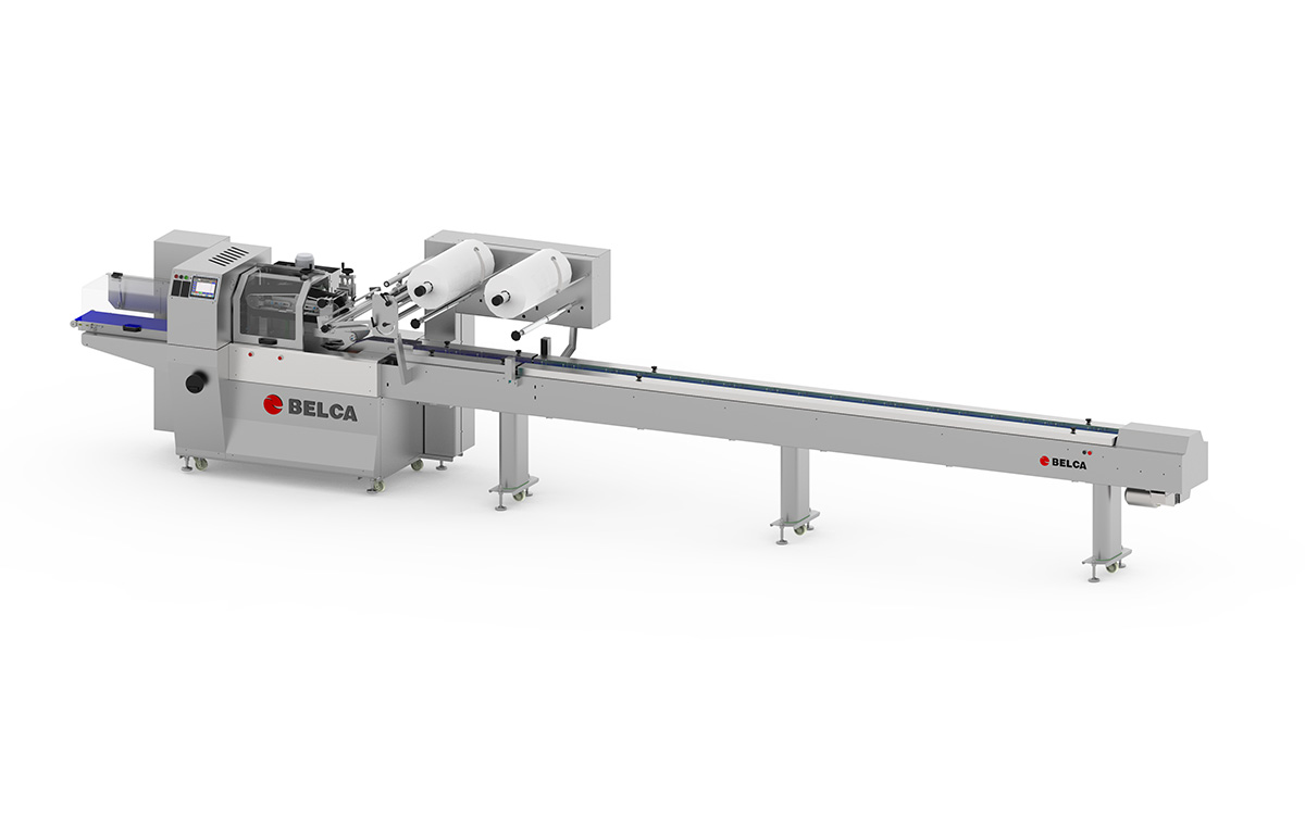 - Envolvedora horizontal con bobina inferior y soldadura superior, construida para productos de alimentación con films de polipropileno o complejos. Entrada por banda motorizada y asíncrona para no limitar la longitud del producto.